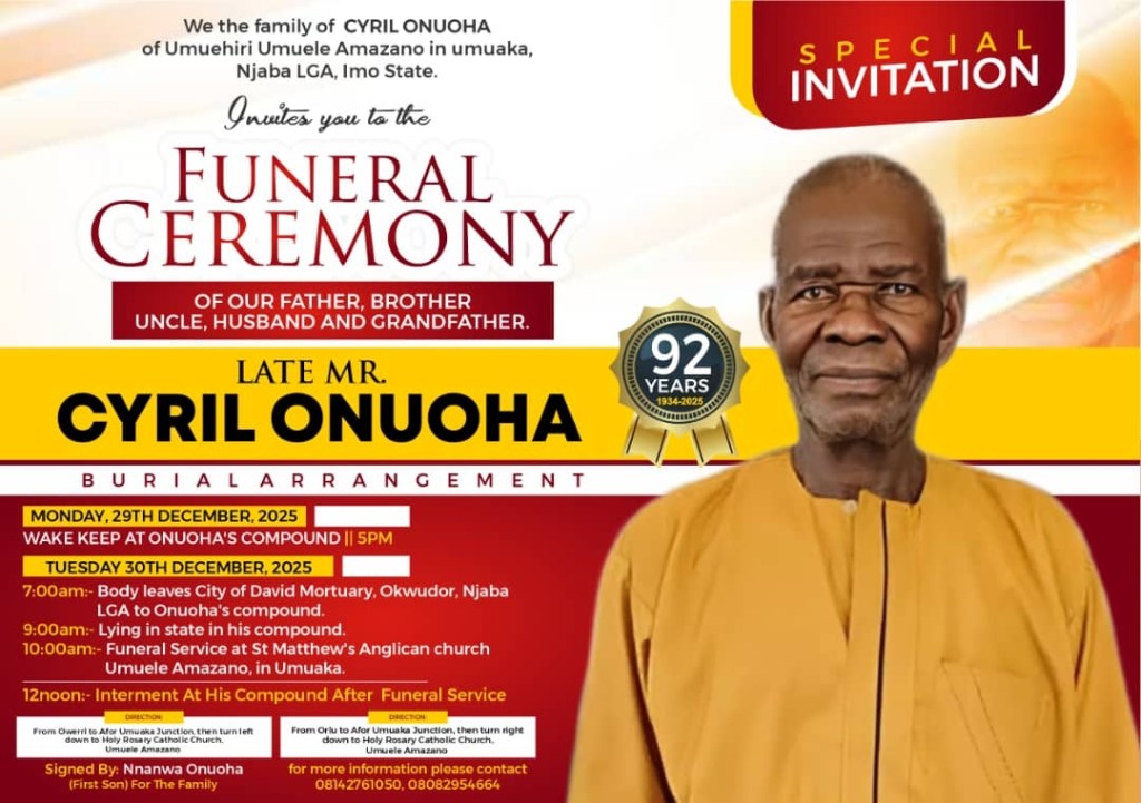 Today, Tuesday 30th December 2025 is the funeral of late Mr. Cyril Onuoha of Umuehiri, Umuele Amazano.